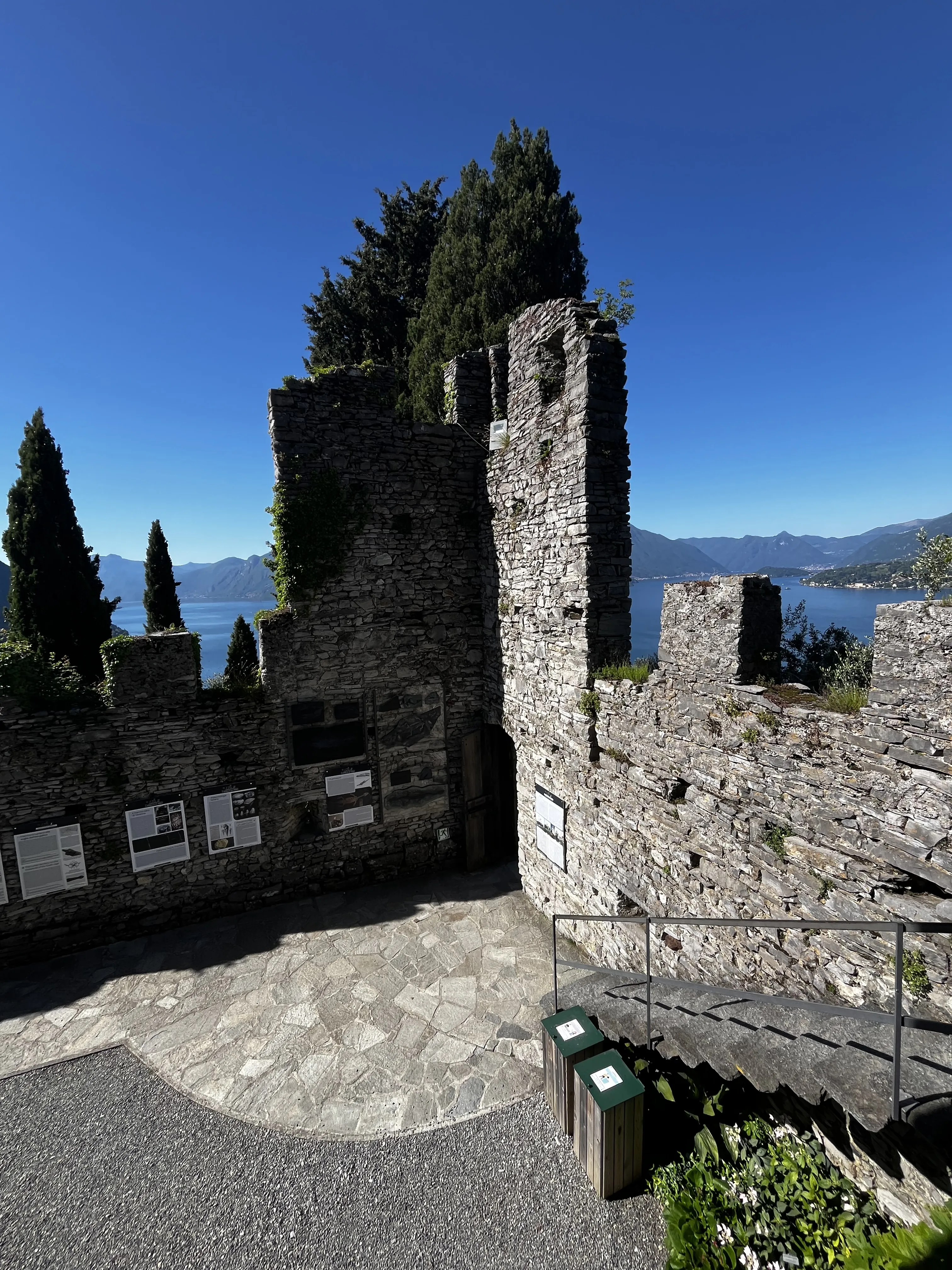 The hike up to Castello Di Vezio was intense – a steep cobbled track that wound its way up the hillside through the forest. After about a 25-minute trek, we reached the top and emerged from the forest trail at the grounds of the castle. We entered the grounds and looked around the gardens, which were lovely – with amazing views of Lake Como in all directions, shouldered by the steep hills and occasional snow-capped mountains.